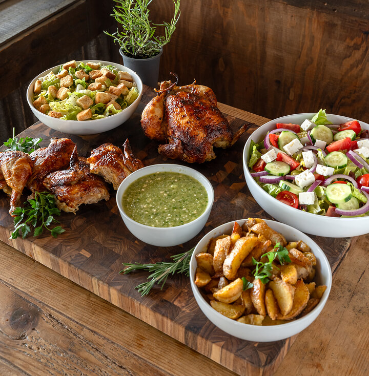 Each catering meal includes ¼ rotisserie chicken, two side orders, and our signature garlic pepper sauce. Meals are served buffet-style with a minimum order of 10.
